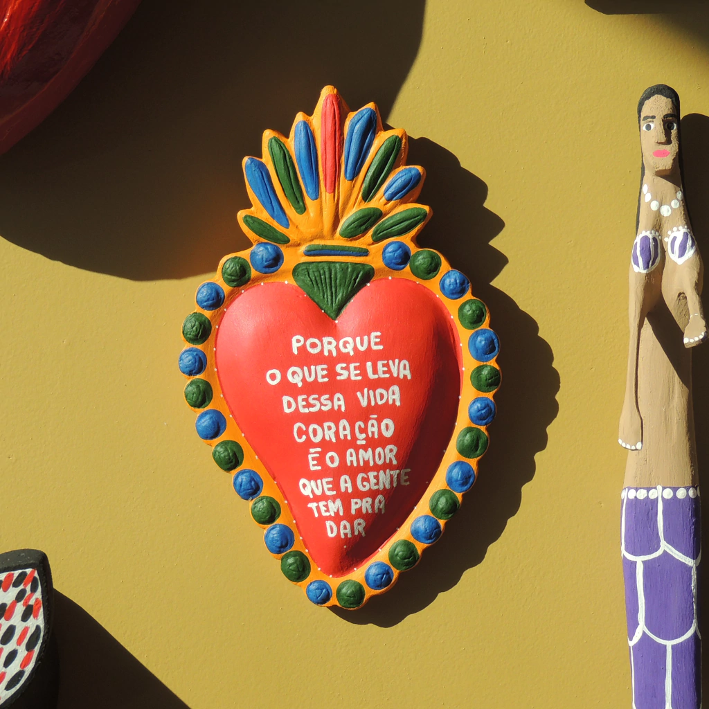Thaís Ribeiro, nascida em Salvador (BA), começou a pintar vasos de barro durante a pandemia em 2020, transformando um passatempo em trabalho autoral. Suas primeiras criações foram inspiradas nas lembranças do interior baiano, especialmente no céu estrelado da roça do avô, em Serrinha. Ao longo de quatro anos, ela consolidou uma arte marcada pelo orgulho nordestino e pela valorização da cultura popular. Em 2023, ao pintar uma peça em formato de sagrado coração, Thaís decidiu incorporar referências musicais e simbólicas do Nordeste, inspirando-se em artistas como Alceu Valença, Marinês, Dominguinhos e Luiz Gonzaga. Desde então, seus “corações” refletem memórias afetivas, festas do interior e a sonoridade da música nordestina.